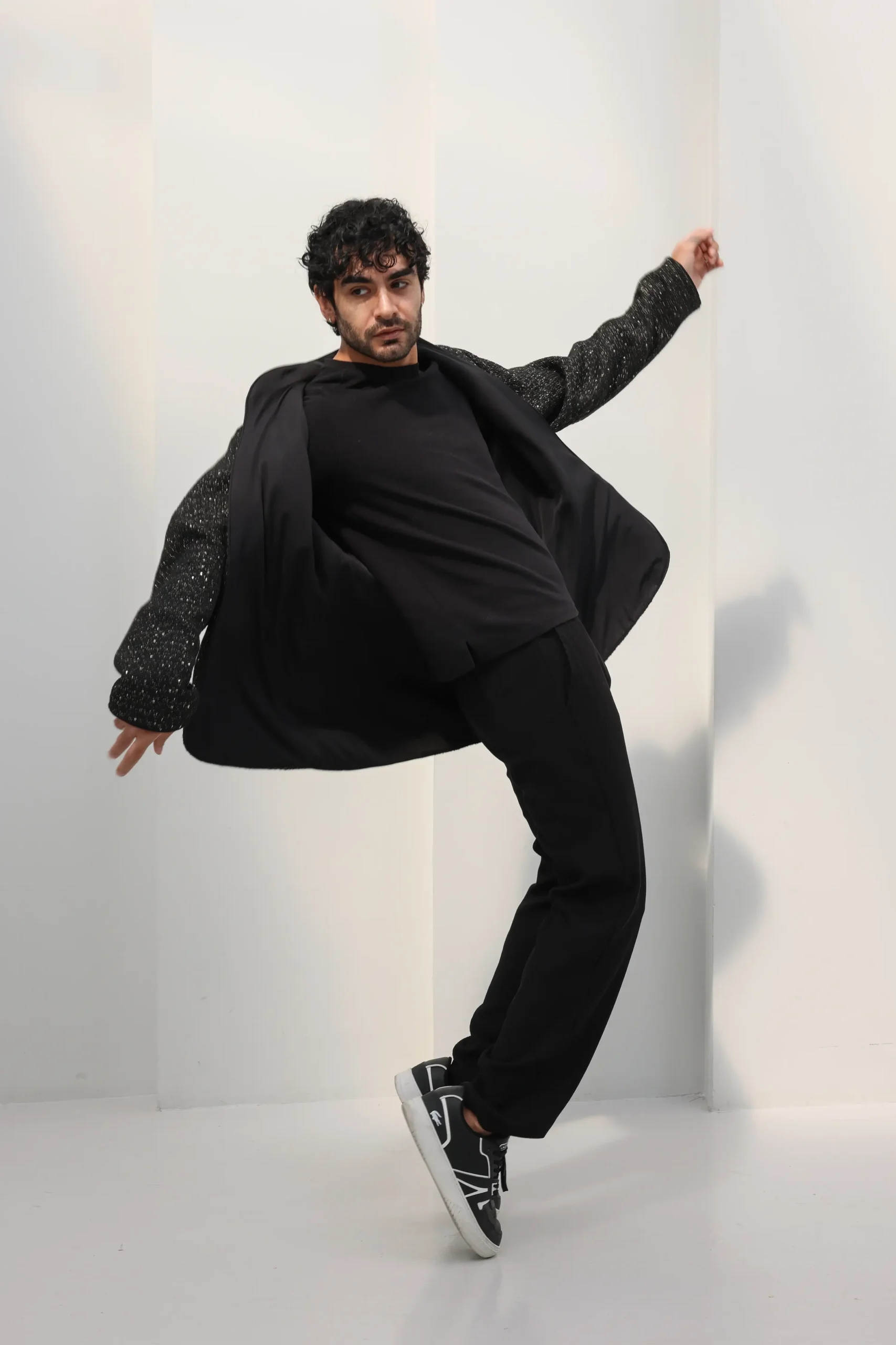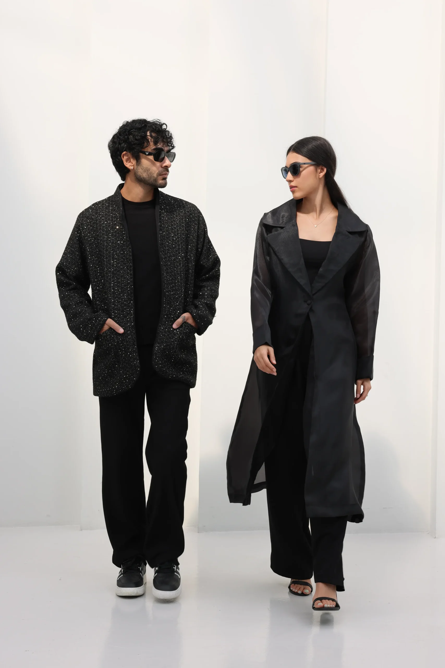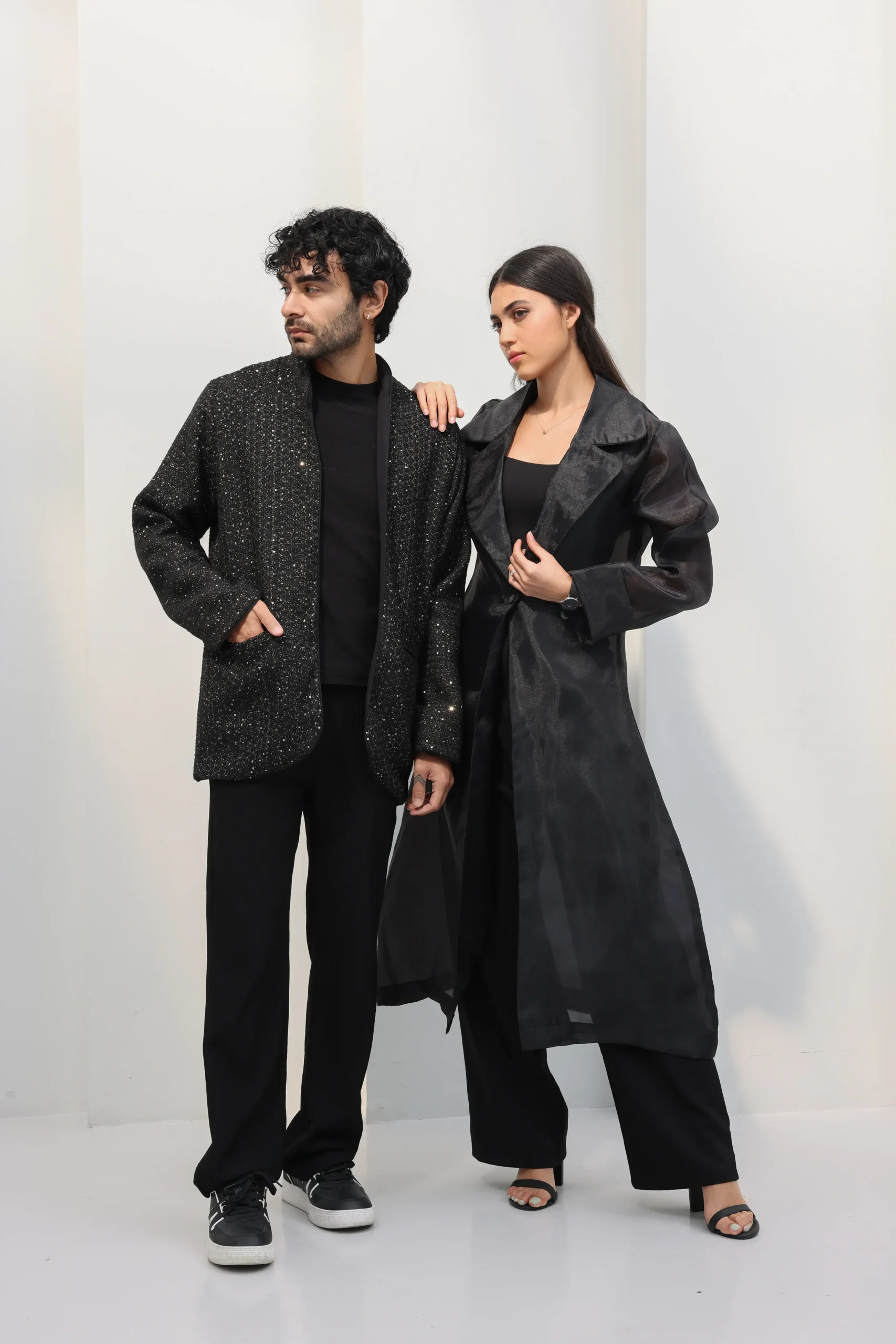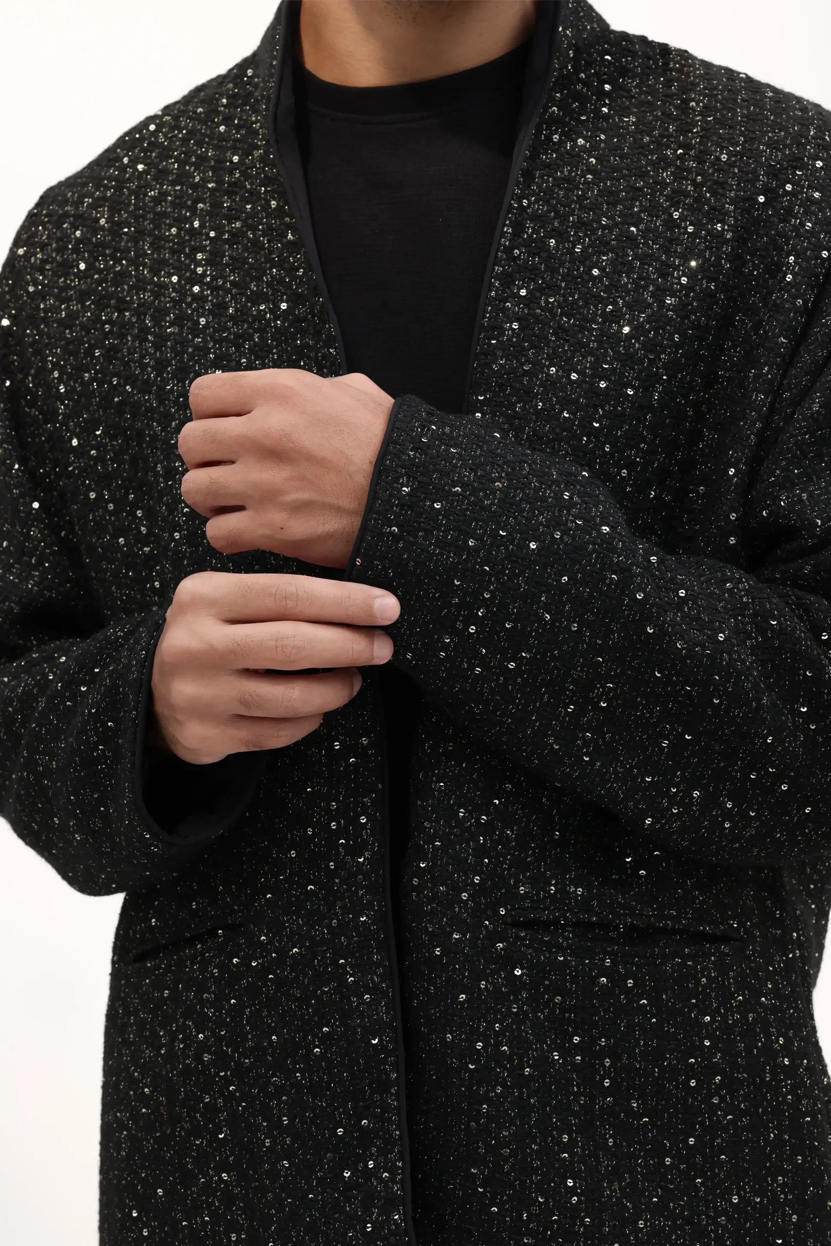 A sequinned jacket with subtle shine and sharp tailoring, made for elevated nights.